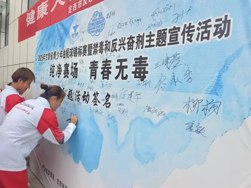 活动首先举行了庄严而热烈的“纯净赛场、青春无毒”主题签名仪式。在签名主题展架前,青少年运动员们有序上前,郑重地签下自己的名字。每一个名字都是一份庄严的承诺,代表着甘肃青少年运动员对干净体育、健康人生的坚定追求,展现了他们捍卫体育精神、远离一切毒害的决心与风采。
